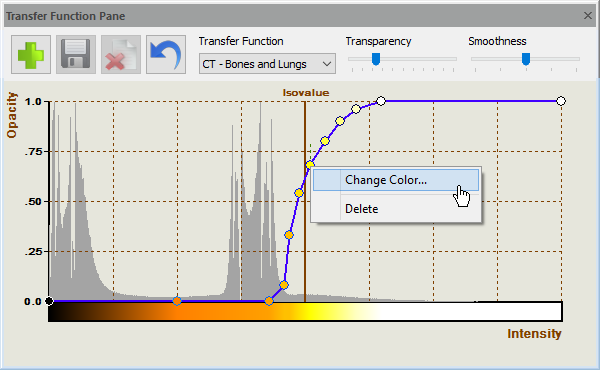 The user can design the transfer function with use of the Transfer Function Pane that allows the user to insert a control point in a specific intensity value, and to define the color and the opacity/transparency value of the control point. The Transfer Function Pane is accessible via the menu command "ViewPanes and Satus BarTransfer Function Pane".