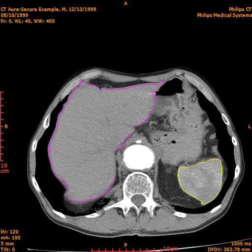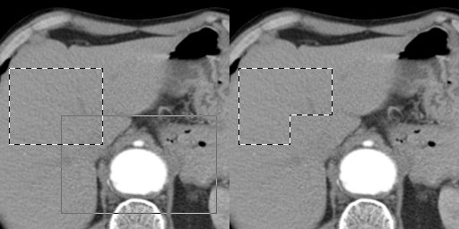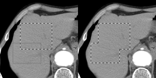 Selection tools accuracyThe selection tools of the program are very accurate. They have been tested for their accuracy against other well-established image processing tools like Adobe® PhotoshopTM and Corel® Paint Shop ProTM. The statistical results (number of pixels, minimum value, maximum value, mean value, standard deviation, etc.) for the same selected area, are the same in all the programs. Back to contentsSelection toolsRectangle:The rectangle tool lets you select a rectangular area of your image. Polygon: The polygon tool lets you draw straight-edged segments of a selection border. Circle: The circle tool lets you select a circular area of your image. Ellipse: The ellipse tool lets you select an elliptical area of your image. Free Hand: The free hand tool lets you draw freehand segments of a selection border. Magic Wand: The magic wand tool lets you select a continuous area of similar intensity without having to trace its outline. When you have selected an area with the magic wand tool and before change tool, if you modify the tolerance the selected area is modified accordingly with the new tolerance. You can adjust the tolerance with the menu command Selection Tolerance Dialog Box of the View menu. Eyedropper: The eyedropper tool lets you select non-continuous areas of your image with similar intensity. When you have selected an area with the eyedropper tool and before change tool, if you modify the tolerance the selected area is modified accordingly with the new tolerance. You can adjust the tolerance with the menu command Selection Tolerance Dialog Box of the View menu. Back to contentsSelection operationsNOTE: Selection operations are available in all the selection tools and in any combination of them.In the examples is used the selection rectangle tool. Selection Addition Before you select the second area hold down the <Shift> key of the keyboard, and then use your mouse for the second selection. ![]() Selection Subtraction Before you select the second area hold down the <Ctrl> key of the keyboard, and then use your mouse for the second selection. ![]() Selection Intersection (common area) Before you select the second area hold down the <Shift> and <Ctrl> keys of the keyboard, and then use your mouse for the second selection. ![]() You can use the Magic Wand and the Free Hand tools in combination, to select a complex area of your image. ![]() Back to contentsSelection statistics, area and volume measurementsFrom the menu Selection, use the command Current Selection Info.The below dialog box will show the area and volume measurements of the selected area, and a simple statistical analysis. You can adjust the pixel spacing and slice thickness especially if this information is not included in the file's header. If you have made selections in more than one frame, the dialog box shows the details of all the selections. ![]() Back to contentsExport a selection to a text fileFrom the menu Selection, use the command Export To Text File.The selected area of the current frame is exported in the form of X position, Y Position, Value. You can use these files from other programs, for further analysis. ![]() Back to contentsKeep many selections as Regions of Interest (ROI)Many times, you want to create many Regions of Interest for some kind of study. These ROIs are created from selections with the menu command Keep Selection. You can keep as many selections as you want, the only limit is the computer's memory. Use the command Kept Selection Info, to see the details of the selections. Anyone of these ROIs has its color. You can delete a ROI, modify its color, export it to a text file, or restore it back as selection.