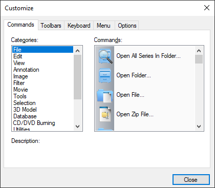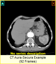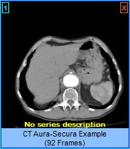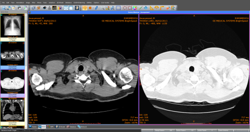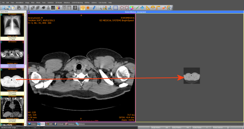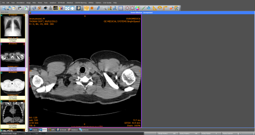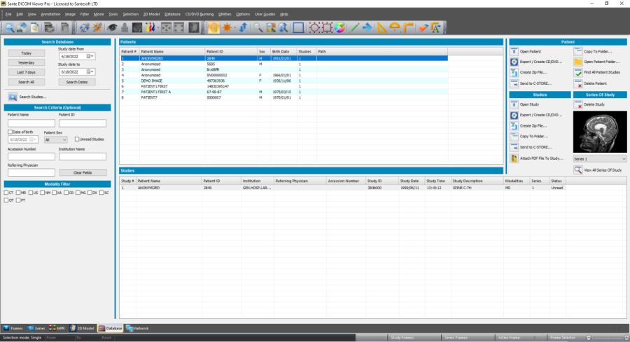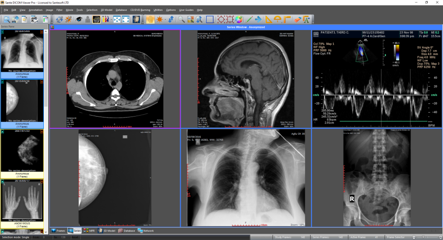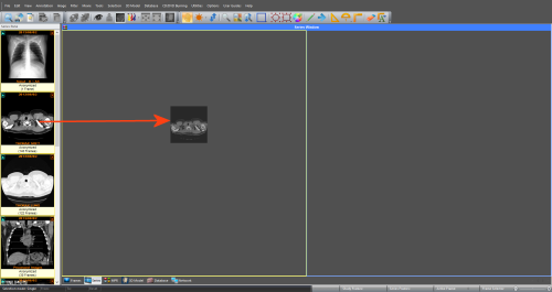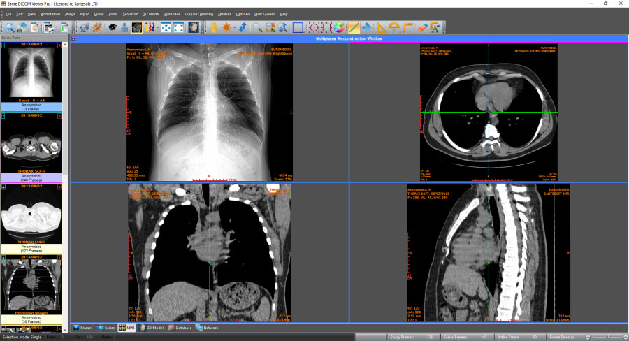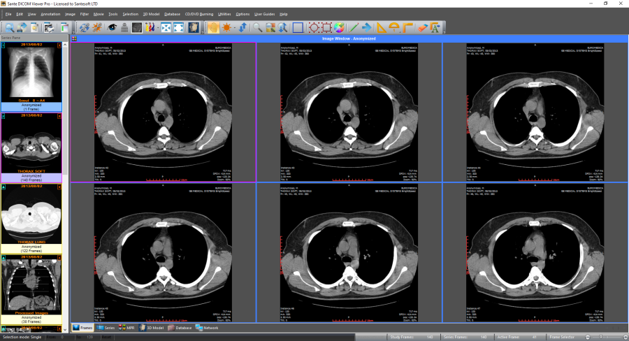 The "MPR Mode" that displays the scout image/localizer, the axial volume of the series and the volumes of the coronal and sagittal reconstructions of the series. The "Database Mode" that allows the user to query and retrieve series and studies from the local database. 1. Menu bar The menu bar contains the commands of the program. 2. Toolbars The toolbars provide shortcut buttons for the most useful commands of the program. The program allows the user to add and remove toolbar buttons, so it fits their tastes and preferences. 3. Series Pane This pane displays a thumbnail for every open series. Every series thumbnail has the patient name, the series description and the number of frames of the series. All the opened series are displayed in the series pane (3) as thumbnails. If the user has loaded a series in the main window, this series is displayed with blue color. Otherwise is displayed with yellow color. ![]() 4. Main window The main window is the working area of the user. The main window displays the frames of the active series (Frame mode), or one frame of all the loaded series (Series mode). The user can select the mode of the main window from the Frames/Series selection tab. Every mode can have different number of tiles, and the user can select the number of tiles with the "Options Tiles Layout" menu command.![]() 5. Frames/Series/MPR/Database selection tab If the tab "Frames" is selected the main window displays the frames of the active series (Frame Mode). If the tab "Series" is selected the main window displays all the loaded series (Series Mode). If the tab "MPR" is selected the main window displays the scout image/localizer and the axial/coronal/sagittal volumes of the series (MPR Mode). If the tab "Database" is selected the main window displays the interface of the local database (Database Mode). The main window in the frame mode (one tile) ![]() The main window in the frame mode (six tiles): Displays six frames of the active series. The number of the tiles is selectable by the user. ![]() The main window in the series mode (four tiles): Displays four different series. The number of the tiles is selectable by the user. The active series has a red rectangle around its tile. ![]() The main window in the series mode displays the cross-reference lines of the series, if the series belong to the same study and the same patient. ![]() The main window in the MPR mode ![]() The main window in the database mode: Displays the contents of the integrated database. ![]() 6. Frame selection slider If the active series has many frames, this slider lets the user select the active frame. Otherwise is disabled. 7. Frame range selection buttons Processing, selection, annotation and zoom actions can work with the current image or with a range of images. Use these buttons to select the frame range for these actions. By pressing the "From" button of the status bar, the current frame becomes the first frame of the range. By pressing the "To" button of the status bar, the current frame becomes the last frame of the range. By pressing the "Reset" button of the status bar, the frame range involves all frames of the multi-frame file or the multi-file series. The user can set up the frame range with the menu command "Edit Set Frame Range" as well.