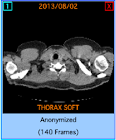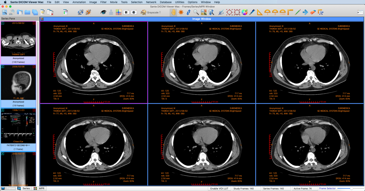 4. Series Pane This pane displays thumbnails of the open series. Every series thumbnail has the patient name, the series description and the number of frames of the series. 5. Main window The main window is the working area of the user. The main window displays the frames of the active series (Frame mode), or one frame of all the loaded series (Series mode). The user can select the mode of the main window from the Frames/Series selection tab. Every mode can have different number of tiles, and the user can select the number of tiles with the Tiles Layout menu command. ![]() 6. Frames/Series/MPR selection tab If the tab "Frames" is selected the main window displays the frames of the active series (Frame Mode). If the tab "Series" is selected the main window displays all the loaded series (Series Mode). If the tab "MPR" is selected the main window displays the scout image/localizer and the axial/coronal/sagittal volumes of the series (MPR Mode). 7. Frame selection slider If the active series has many frames, this slider lets the user select the active frame. Otherwise is disabled. ![]() The main window in the frame mode (one tile) ![]() The main window in the frame mode (six tiles): Displays six frames of the active series. The number of the tiles is selectable by the user. The active frame has a red rectangle around its tile. ![]() The main window in the series mode (six tiles): Displays four different series. The number of the tiles is selectable by the user. The active series has a red rectangle around its tile. ![]() The main window in the MPR mode ![]() The main window in the Database mode ![]() The main window in the Network mode ![]() |