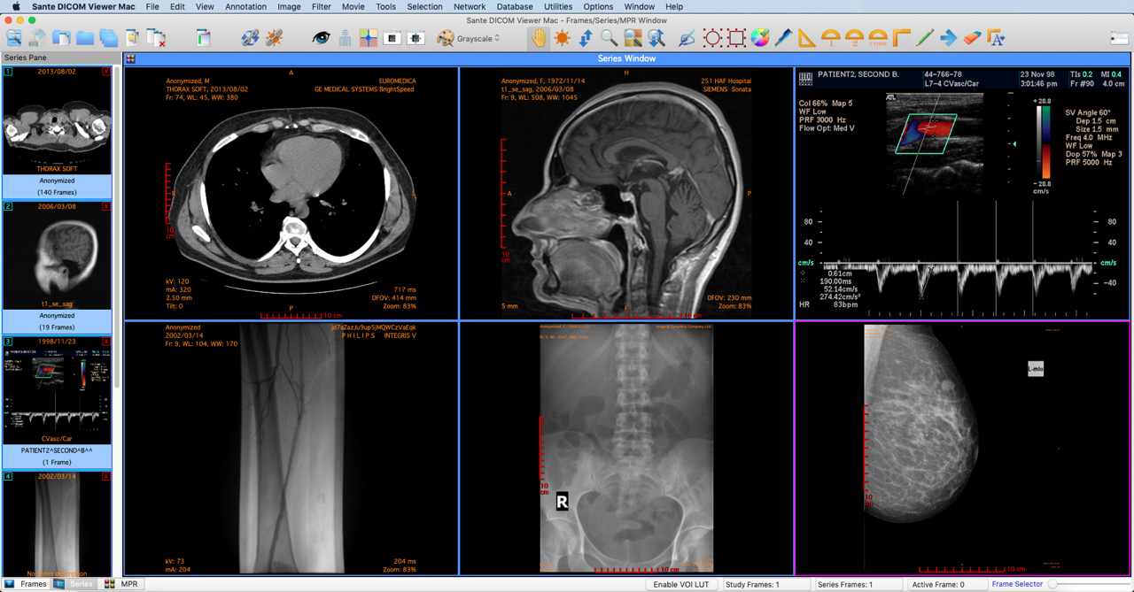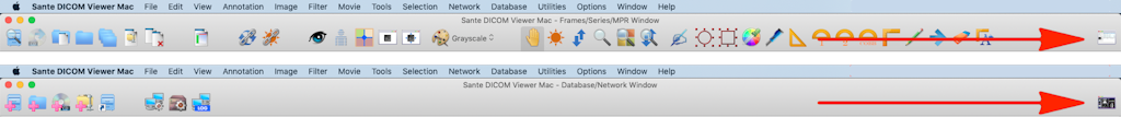 The user interfaceWhen the program starts, it creates two windows: The Frames/Series/MPR window that displays the images of the loaded files, and the Database/Network window that allows the user to work with the Built-in database and to query/retrieve files from the DICOM network.