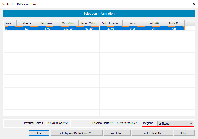 The program also allows calibrated area measurements, when the user has selected an area with a selection tool. The program by default uses for the calculations the first calibrated region that has spatial units (cm, mm) in its Physical Delta X and Y, but the user can use the "Region" combo box to change this region with another.