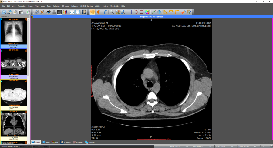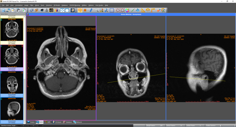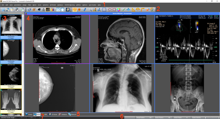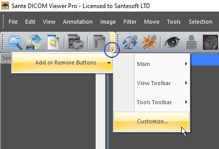 The user interface![]() The user interface is divided in 7 parts: 1. The menu bar 2. The toolbars 3. The series pane 4. The main window 5. The Frames/Series/MPR/Database Mode selection tab 6. The frame selection slider 7. The frame range selection buttons The program works with DICOM series. If the user open a single file, the program creates a series with this file in the memory, and works with this single-file series. If the user open a study the program works with all the series of this study. All the opened series are displayed in the series pane (3) as thumbnails. The user can load an open series in the main window by double-clicking its thumbnail in the series pane (3), or by clicking the green arrow in the upper-left corner of the thumbnail. The series that have been loaded in the main window have blue color, and the series that have not been loaded in the main window have yellow color. The user can close a series by clicking the red X symbol in the upper-right corner of the thumbnail. ![]() ![]() The main window (4) is divided in tiles and it has four modes: The "Frame Mode" that displays in its tiles the frames of the same series (the active series). The user can select the number of the tiles with the "Options ![]() The "Series Mode" that displays in its tiles all the loaded in the main window series. The user can select the number of the tiles with the "Options ![]() The active series is displayed in the "Series Mode" with a red rectangle around its tile (4). The user can select the active series by clicking its tile in the "Series Mode", or by single-clicking its thumbnail in the series pane. If a series is loaded in the main window, in the upper-left corner of its thumbnail is displayed the number of its "Series Mode" tile. If the user press the right mouse button in a "Series Mode" tile, a pop-up menu appears and lets the user empty the tile, empty all tiles, change the series tile, load another series to this tile and close the series that is loaded in this tile. This menu is not available in the "Frames Mode". ![]() The "MPR Mode" that displays the scout image/localizer, the axial volume of the series and the volumes of the coronal and sagittal reconstructions of the series. The "Database Mode" that allows the user to query and retrieve series and studies from the local database. 1. Menu bar The menu bar contains the commands of the program. 2. Toolbars The toolbars provide shortcut buttons for the most useful commands of the program. The program allows the user to add and remove toolbar buttons, so it fits their tastes and preferences. 3. Series Pane This pane displays a thumbnail for every open series. Every series thumbnail has the patient name, the series description and the number of frames of the series. All the opened series are displayed in the series pane (3) as thumbnails. If the user has loaded a series in the main window, this series is displayed with blue color. Otherwise is displayed with yellow color. ![]() ![]() 4. Main window The main window is the working area of the user. The main window displays the frames of the active series (Frame mode), or one frame of all the loaded series (Series mode). The user can select the mode of the main window from the Frames/Series selection tab. Every mode can have different number of tiles, and the user can select the number of tiles with the "Options ![]() ![]() 5. Frames/Series/MPR/Database selection tab If the tab "Frames" is selected the main window displays the frames of the active series (Frame Mode). If the tab "Series" is selected the main window displays all the loaded series (Series Mode). If the tab "MPR" is selected the main window displays the scout image/localizer and the axial/coronal/sagittal volumes of the series (MPR Mode). If the tab "Database" is selected the main window displays the interface of the local database (Database Mode). The main window in the frame mode (one tile) ![]() The main window in the frame mode (six tiles): Displays six frames of the active series. The number of the tiles is selectable by the user. ![]() The main window in the series mode (four tiles): Displays four different series. The number of the tiles is selectable by the user. The active series has a red rectangle around its tile. ![]() The main window in the series mode displays the cross-reference lines of the series, if the series belong to the same study and the same patient. ![]() The main window in the MPR mode ![]() The main window in the database mode: Displays the contents of the integrated database. ![]() 6. Frame selection slider If the active series has many frames, this slider lets the user select the active frame. Otherwise is disabled. 7. Frame range selection buttons Processing, selection, annotation and zoom actions can work with the current image or with a range of images. Use these buttons to select the frame range for these actions. By pressing the "From" button of the status bar, the current frame becomes the first frame of the range. By pressing the "To" button of the status bar, the current frame becomes the last frame of the range. By pressing the "Reset" button of the status bar, the frame range involves all frames of the multi-frame file or the multi-file series. The user can set up the frame range with the menu command "Edit ![]() The program supports the "drag-and-drop" operation. ![]() ![]() ![]() ![]() Customize the toolbarsThe program allows the users to add or remove toolbar buttons, so it fits their tastes and preferences.Any toolbar can be quickly customized with the "Add or Remove Buttons" submenu available from the chevron button when it is docked or with a special button in the toolbar caption when it is in the floating state. ![]() By selecting the menu item "Customize" a dialog box appears and allows the user to drag-and-drop buttons from the dialog box to any toolbar. It allows also the user to drag buttons out of a toolbar, to remove them. ![]() |